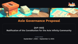 Axie Infinity今すぐAxie憲法に投票しましょう! App.axie で投票しましょう🗳️ 2025年9月1日 要点 今すぐAxie憲法に投票しましょう!AIP-002の投票期間がApp.axieで始まりました。9月8日までにAxie憲法採択に投票してください!... 2025.09.03Axie Infinity