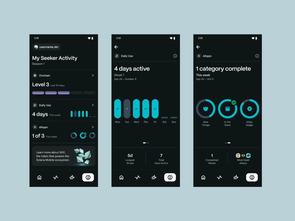 SeekerのSeed Vaultウォレットで利用可能なアクティビティトラッキングは、オンチェーン取引、dAppの探索、そして日々のデバイス使用状況を1つのシームレスなエクスペリエンスで視覚化します。これは、一貫した習慣を身につけ、進捗状況を追跡し、Seekerを長期的に活用できるように設計されています。